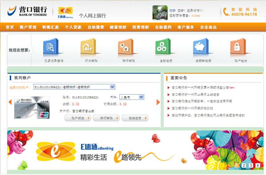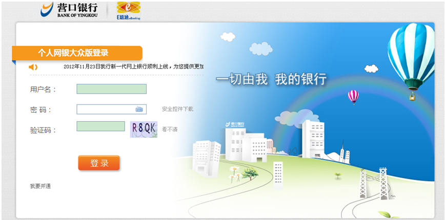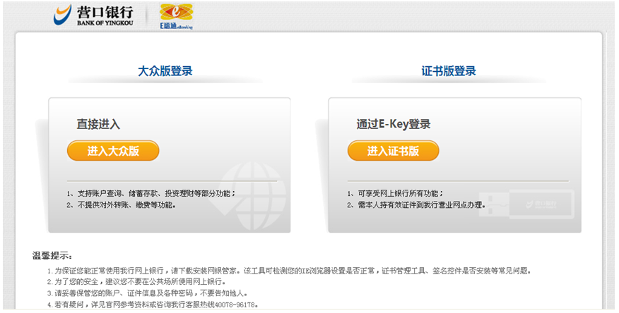 登錄營(yíng)口銀行官方網(wǎng)站(m.saibohuanshi.com),選擇個(gè)人網(wǎng)上銀行,點(diǎn)擊“進(jìn)入大眾版”![]() 點(diǎn)擊“進(jìn)入大眾版”后出現(xiàn)登錄頁(yè)面:![]() ![]() |