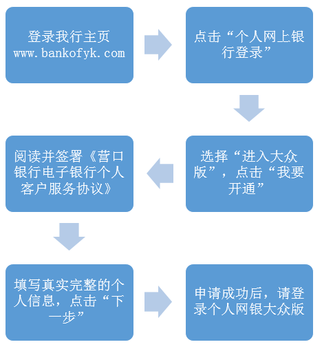 持有營口銀行卡或存折的客戶,可以通過任意一臺連接Internet的電腦登錄m.saibohuanshi.com自助注冊營口銀行個人網(wǎng)上銀行大眾版,具體操作流程如下: ![]() |